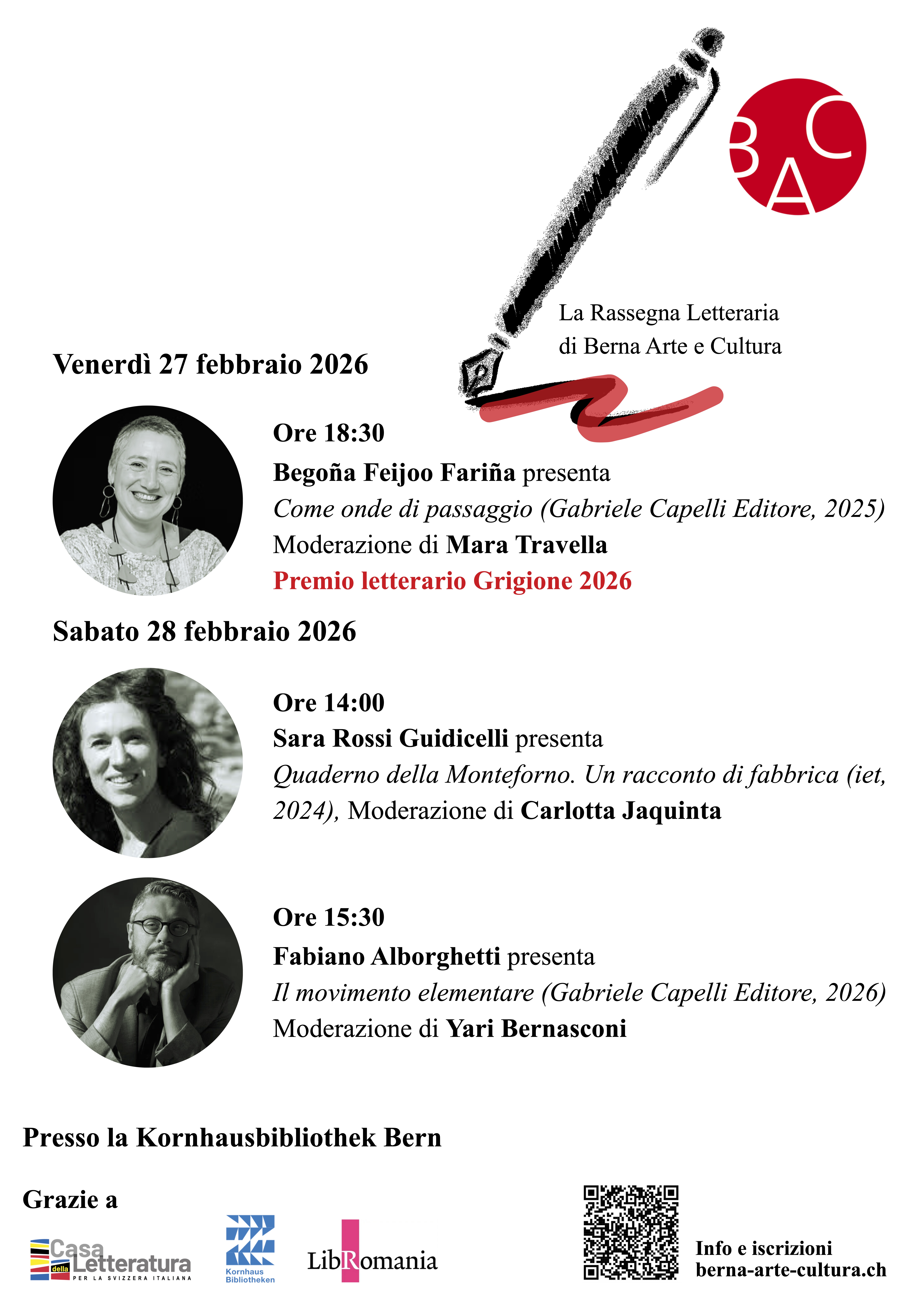 È gradita l’iscrizione tramite il formulario sul sito di Berna Arte Cultura : https://www.berna-arte-cultura.ch/rassegna-letteraria-2026/